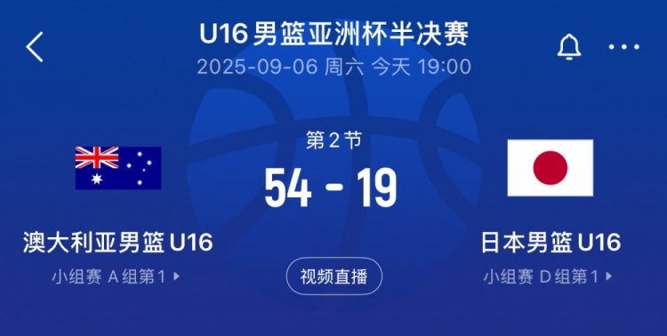9月6日U16男篮亚洲杯半决赛战报:澳大利亚U16半场以54-19大幅领先日本队。
