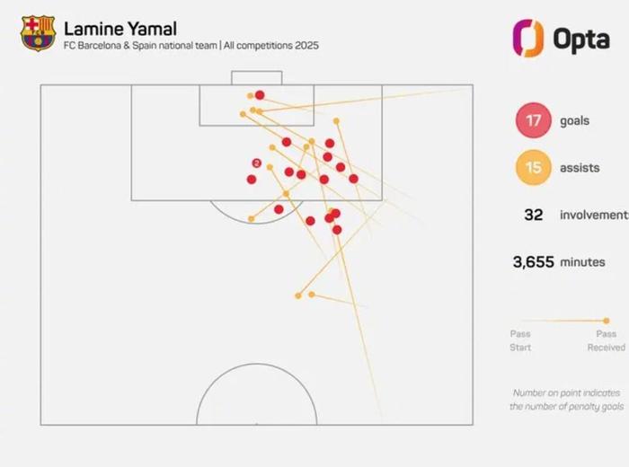 国际比赛日结束,巴萨边锋亚马尔即将返回俱乐部。数据网站Opta也统计了他本年度的数据。