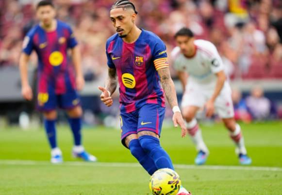 在周日晚进行的西甲第28轮巴萨主场对阵塞维利亚的比赛中,拉菲尼亚在第21分钟完成点球梅开二度,帮助球队取得2-0领先。
